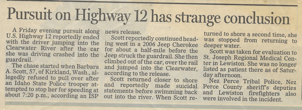 Barbara A. Scott is my ex-wife. This was her response to getting served papers seeking a separation. There was also an entry in the Idaho State Patrol blog (now just a collection of news releases) about the incident. And there was a short video from a Spokane television station.