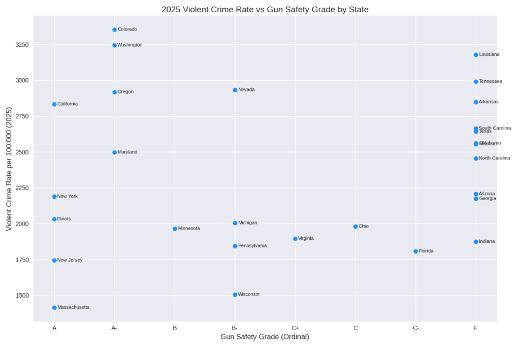 - Interpretation: Gun safety grades and violent crime rates do not show a strong or reliable linear relationship in this dataset. Some states with strong gun laws (A grades) still have high crime rates (e.g., Washington, Colorado), while some F‑grade states have moderate rates (e.g., Indiana, Georgia).