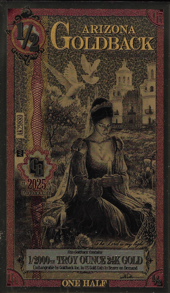 1. There are also 1/2 & 1 Goldbacks of several states. At the current market, a 1/2 contains about $2.70 , but I checked APMEX and they’re selling them for $4.31 (quite the margin there)