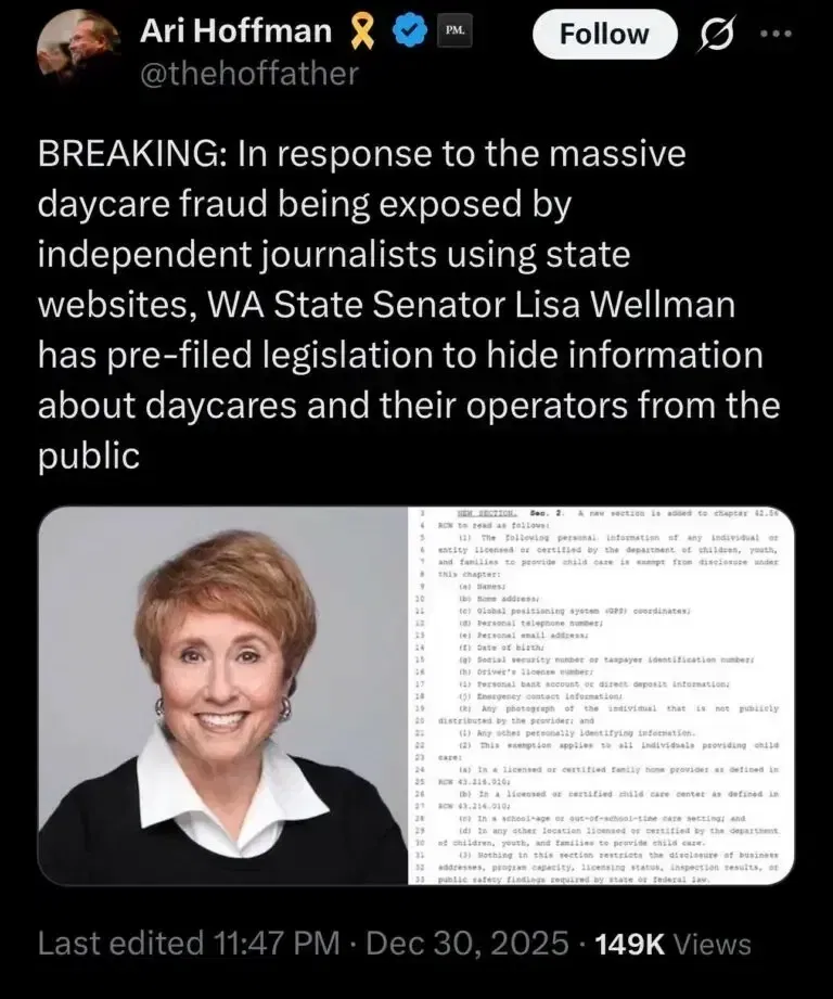 It’s pretty clear they are just front men for the fraud, and it’s being set up and managed by someone else (CIA, state or national Dems, cartels, someone else with an IQ higher than 100 and with connections in government to quash most investigations). The fact the pattern is showing up in other states, like right here in WA and the Dems are moving to hide it rather than investigate means they are complicit in some way (specifically: https://m3.gab.com/media_attachments/dc/6f/51/dc6f51c6d657d038e28b02237c595c72.webp , “BREAKING: In response to the massive daycare fraud being exposed by independent journalists using state websites, WA State Senator Lisa Wellman has pre-filed legislation to hide information about daycares and their operators from the public”