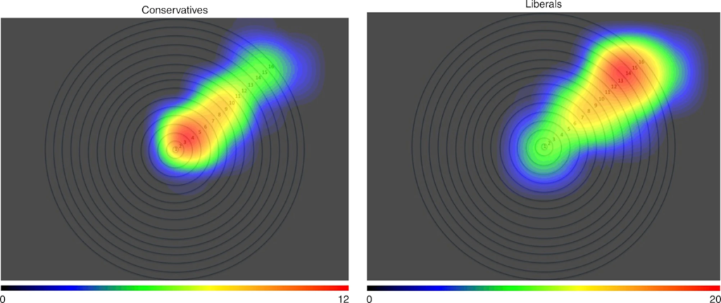 Heatmaps indicating highest moral allocation by ideology, Study 3a. Source data are provided as a Source Data file. Note. The highest value on the heatmap scale is 20 units for liberals, and 12 units for conservatives. Moral circle rings, from inner to outer, are described as follows: (1) all of your immediate family, (2) all of your extended family, (3) all of your closest friends, (4) all of your friends (including distant ones), (5) all of your acquaintances, (6) all people you have ever met, (7) all people in your country, (8) all people on your continent, (9) all people on all continents, (10) all mammals, (11) all amphibians, reptiles, mammals, fish, and birds, (12) all animals on earth including paramecia and amoebae, (13) all animals in the universe, including alien lifeforms, (14) all living things in the universe including plants and trees, (15) all natural things in the universe including inert entities such as rocks, (16) all things in existence