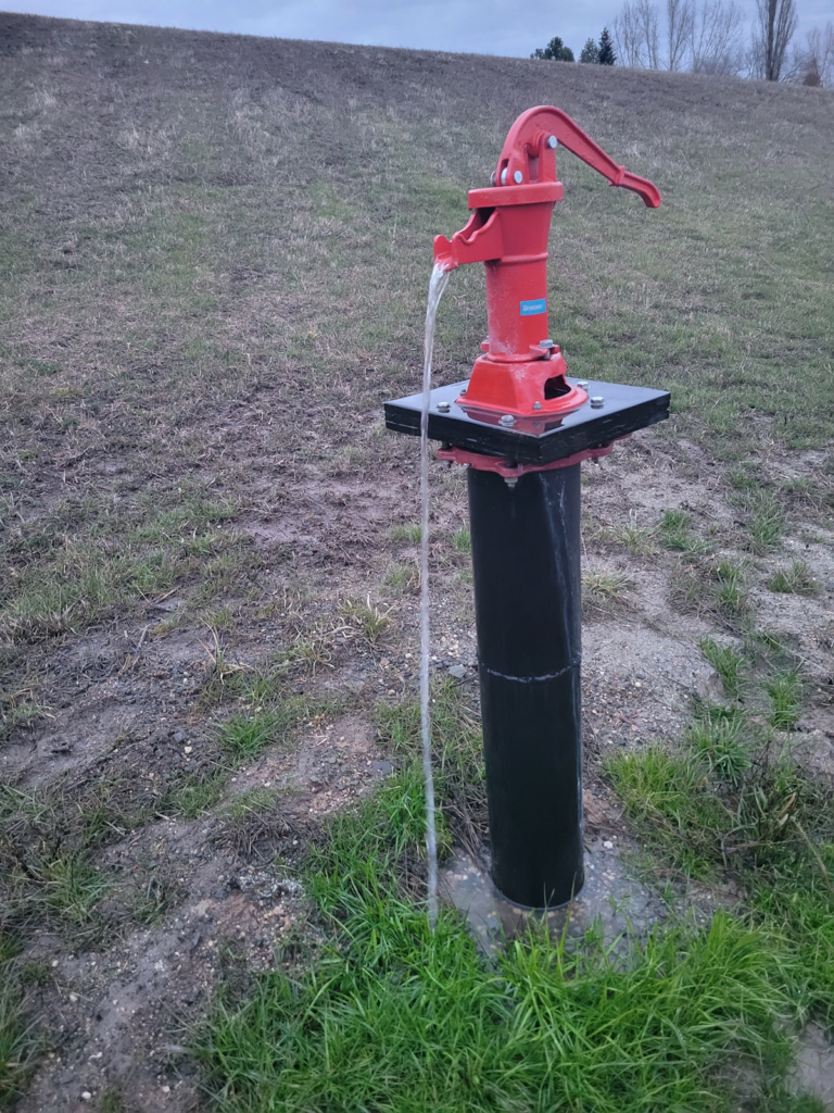 Sometime later, probably about July or August she wanted to talk about the well again. Since she doesn’t have electricity on the property yet, she asked if we could put a hand pump in and she could have water to irrigate a few trees. At five feet below the surface, it would be trivial to pull that water on up and fill buckets with a hand pump. So, we put a pitcher pump in with a ten-foot-long pipe and she had consumable water.